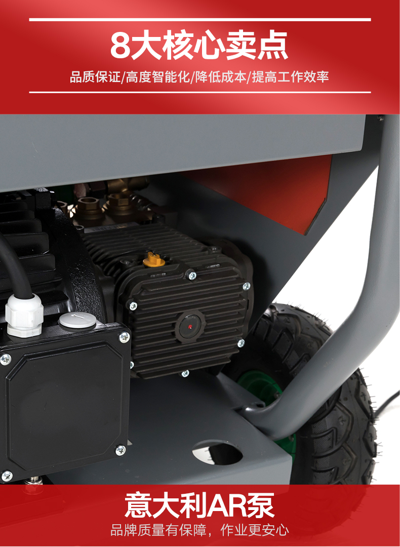 智能降壓,雙過濾,AR泵,語言播報,8大核心賣點:意大利AR泵、嘉陵本田發動機、不銹鋼30米卷管器、意大利MV調壓閥、ETC自動怠速功能、配備急停裝置、單人操作系統、加厚橡膠充氣減震輪胎